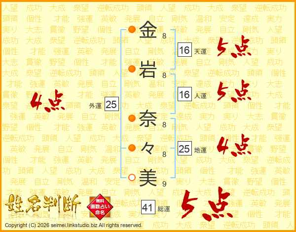 金(8画)岩(8画) 奈(8画)々(8画)美(9画)