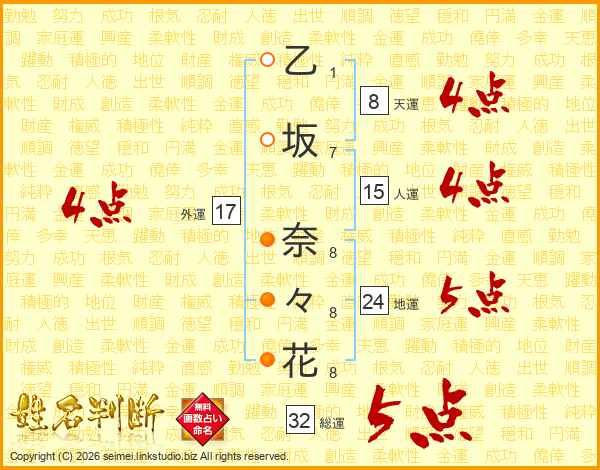 乙(1画)坂(7画) 奈(8画)々(8画)花(8画)