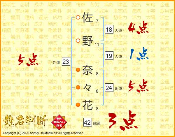 佐(7画)野(11画) 奈(8画)々(8画)花(8画)