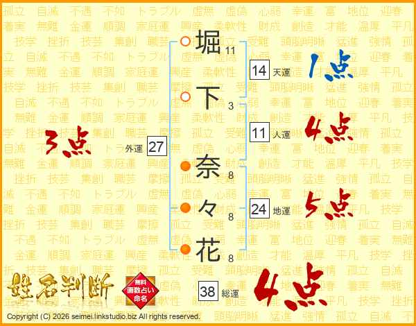 堀(11画)下(3画) 奈(8画)々(8画)花(8画)