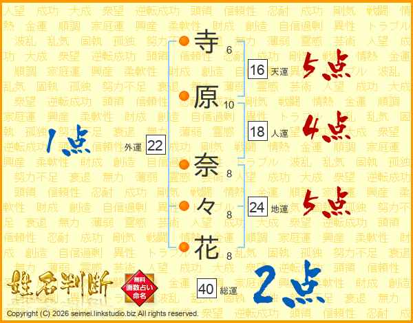 寺(6画)原(10画) 奈(8画)々(8画)花(8画)