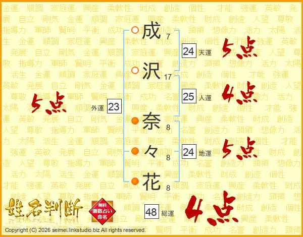 成(7画)沢(17画) 奈(8画)々(8画)花(8画)