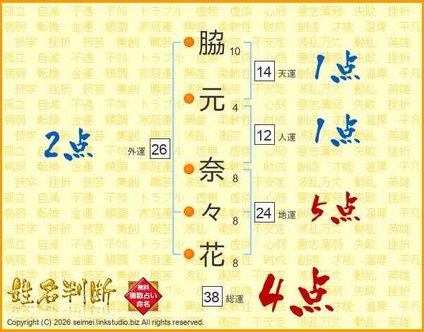脇(10画)元(4画) 奈(8画)々(8画)花(8画)