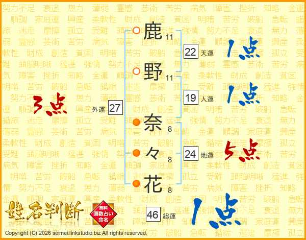 鹿(11画)野(11画) 奈(8画)々(8画)花(8画)