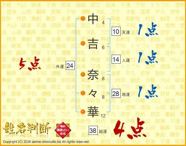 中(4画)吉(6画) 奈(8画)々(8画)華(12画)