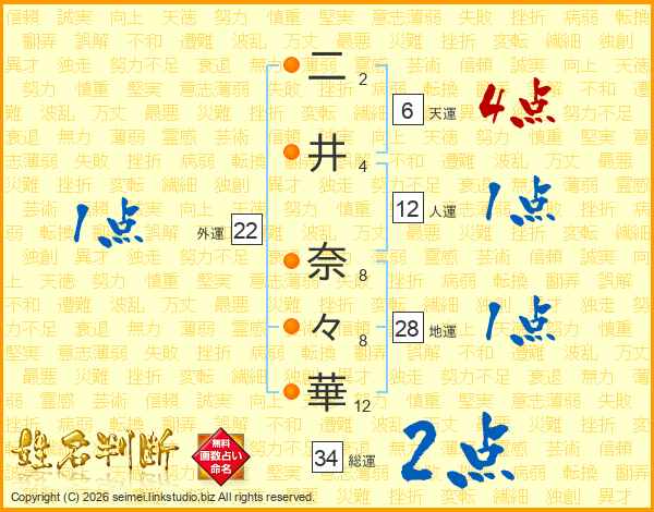 二(2画)井(4画) 奈(8画)々(8画)華(12画)