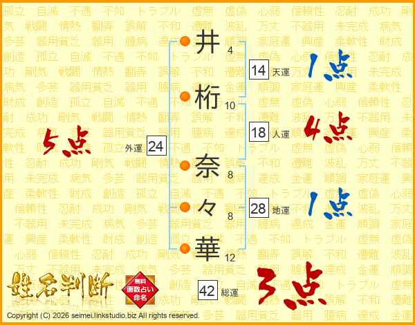井(4画)桁(10画) 奈(8画)々(8画)華(12画)