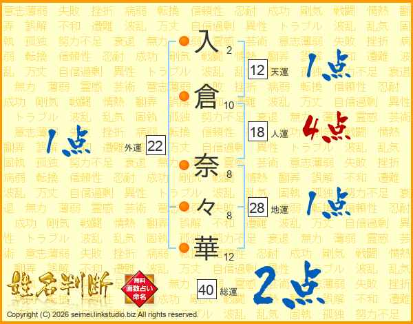 入(2画)倉(10画) 奈(8画)々(8画)華(12画)