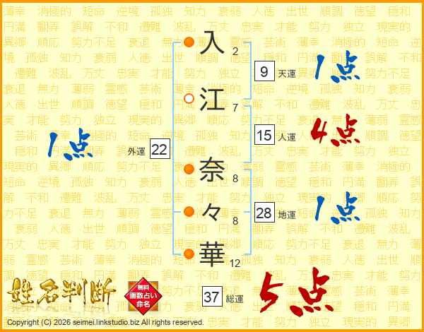 入(2画)江(7画) 奈(8画)々(8画)華(12画)