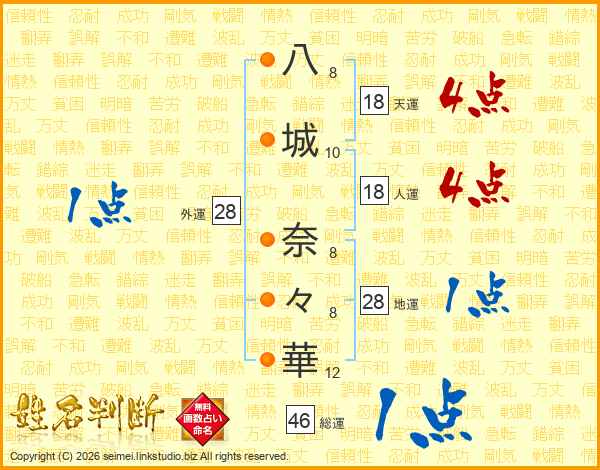八(8画)城(10画) 奈(8画)々(8画)華(12画)