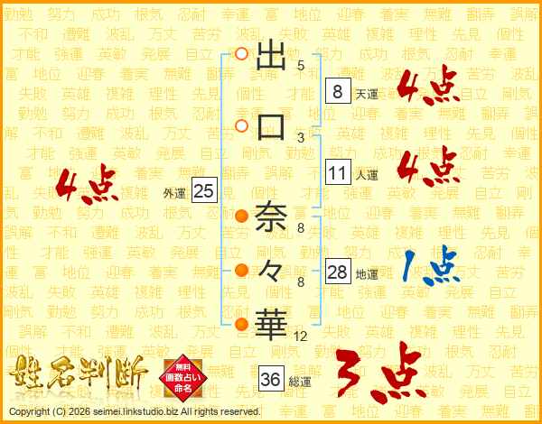 出(5画)口(3画) 奈(8画)々(8画)華(12画)