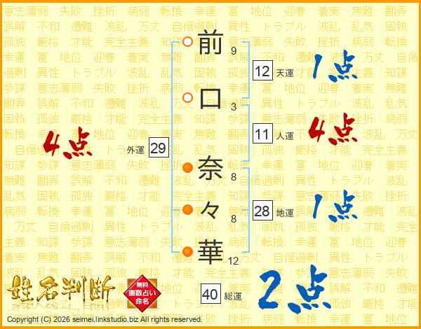 前(9画)口(3画) 奈(8画)々(8画)華(12画)