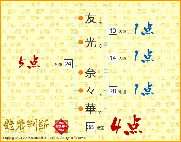 友(4画)光(6画) 奈(8画)々(8画)華(12画)