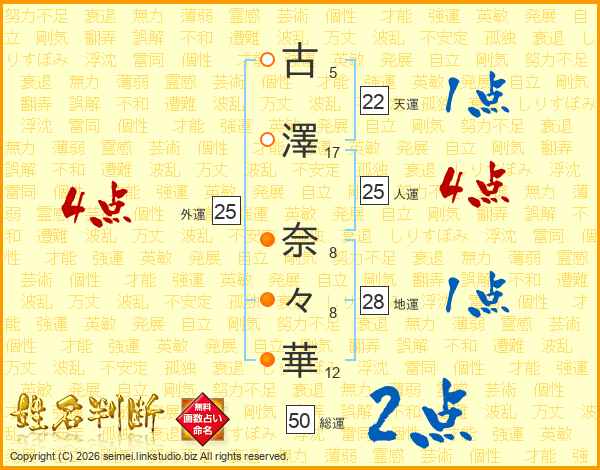 古(5画)澤(17画) 奈(8画)々(8画)華(12画)