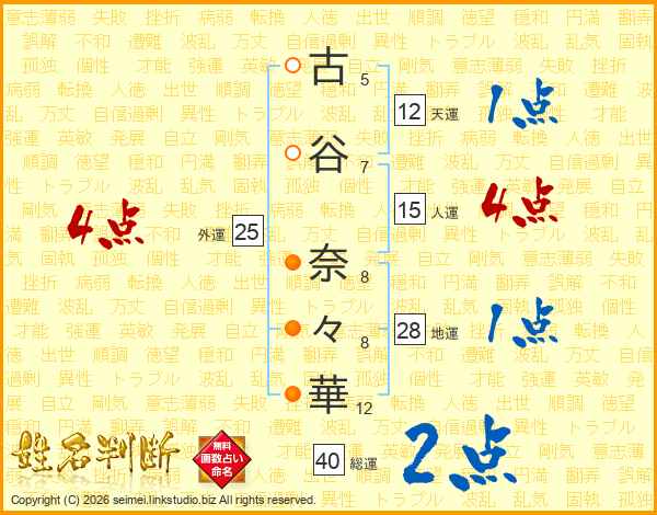 古(5画)谷(7画) 奈(8画)々(8画)華(12画)