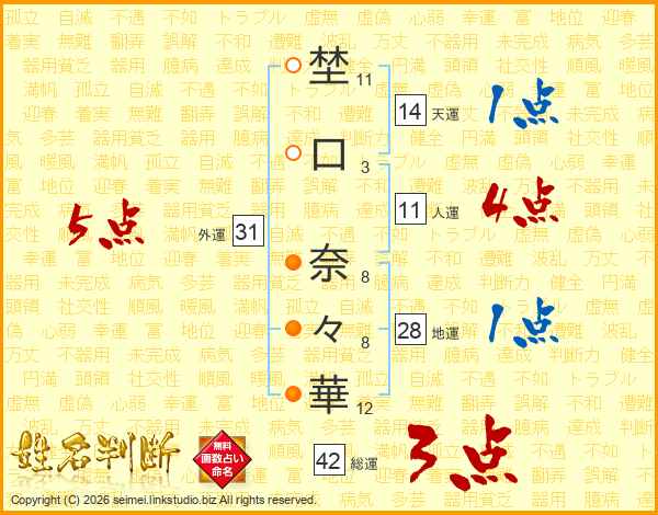 生活面を象徴する運勢です。外部から受ける影響力を表し、結婚運、家庭運や職場、環境への順応性を表します。総運から人運を引いた画数。姓や名が1文字の場合を除く。