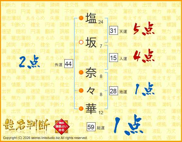 塩(24画)坂(7画) 奈(8画)々(8画)華(12画)
