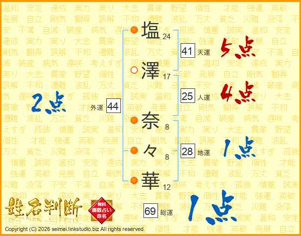 塩(24画)澤(17画) 奈(8画)々(8画)華(12画)