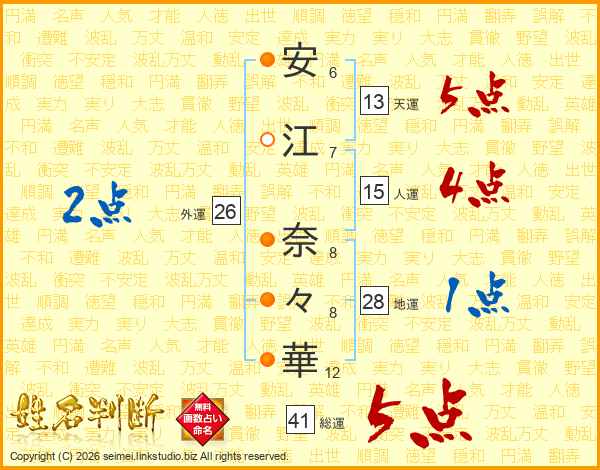 安(6画)江(7画) 奈(8画)々(8画)華(12画)