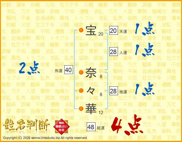 宝(20画) 奈(8画)々(8画)華(12画)