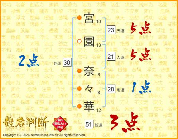 宮(10画)園(13画) 奈(8画)々(8画)華(12画)