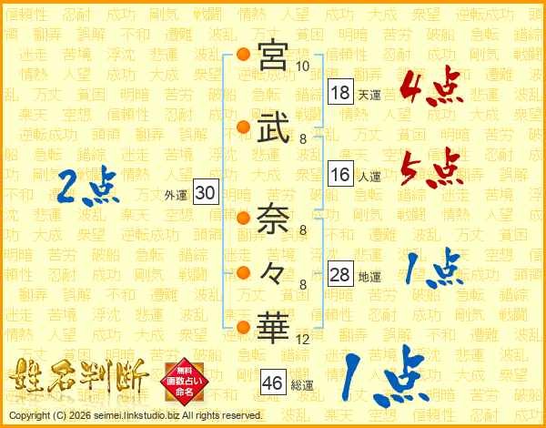 宮(10画)武(8画) 奈(8画)々(8画)華(12画)