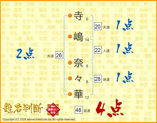 寺(6画)嶋(14画) 奈(8画)々(8画)華(12画)