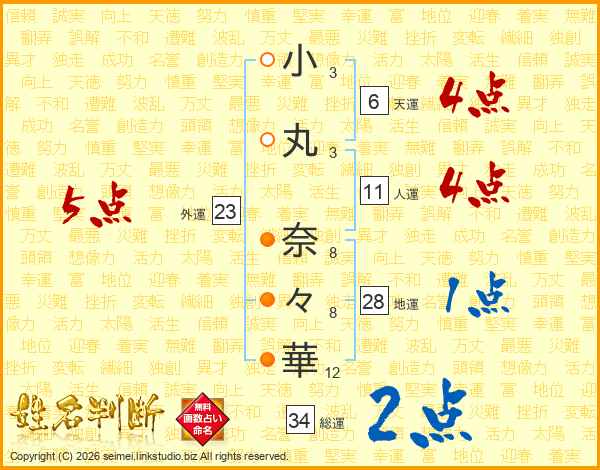 小(3画)丸(3画) 奈(8画)々(8画)華(12画)