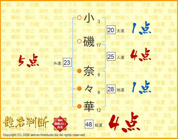 小(3画)磯(17画) 奈(8画)々(8画)華(12画)