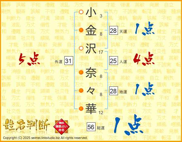 小(3画)金(8画)沢(17画) 奈(8画)々(8画)華(12画)