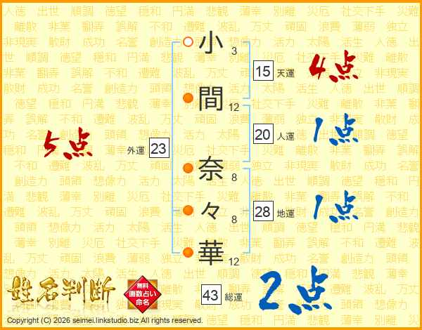 小(3画)間(12画) 奈(8画)々(8画)華(12画)