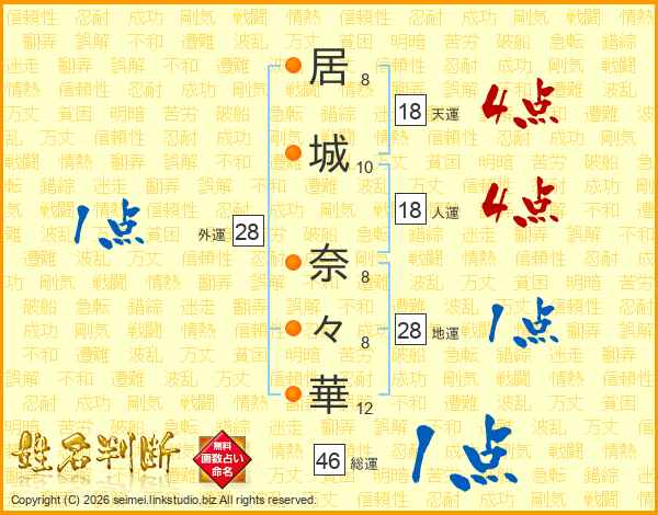 居(8画)城(10画) 奈(8画)々(8画)華(12画)