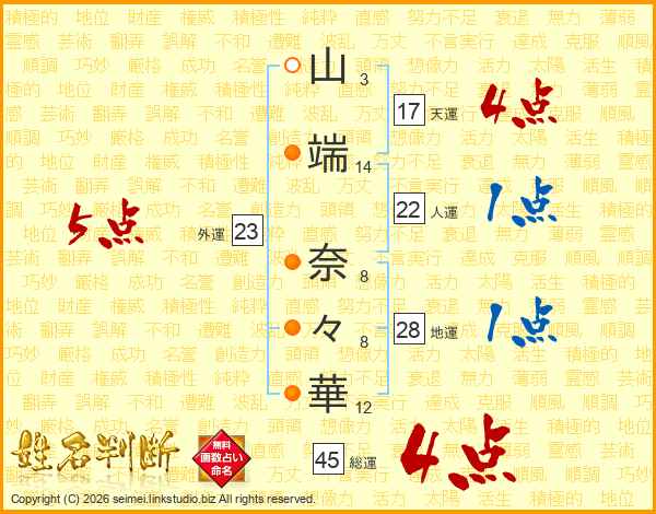 山(3画)端(14画) 奈(8画)々(8画)華(12画)