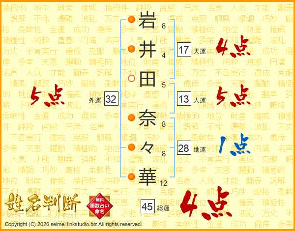 岩(8画)井(4画)田(5画) 奈(8画)々(8画)華(12画)