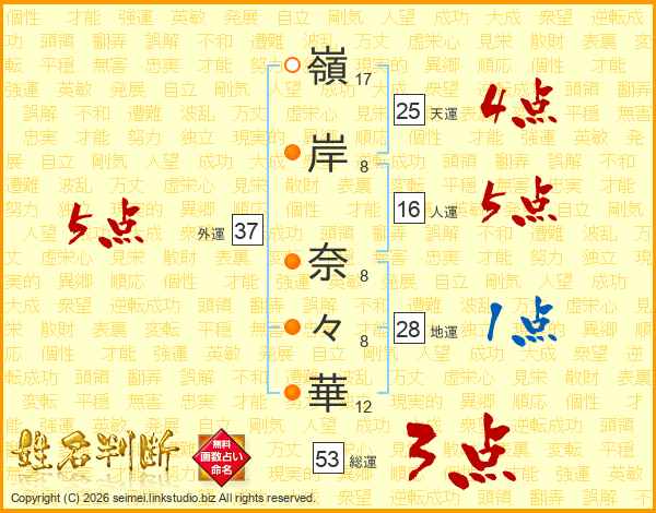 嶺(17画)岸(8画) 奈(8画)々(8画)華(12画)