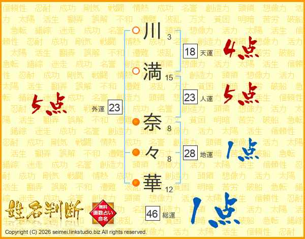川(3画)満(15画) 奈(8画)々(8画)華(12画)