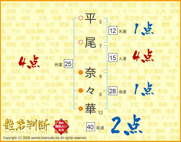 平(5画)尾(7画) 奈(8画)々(8画)華(12画)