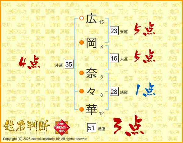 広(15画)岡(8画) 奈(8画)々(8画)華(12画)
