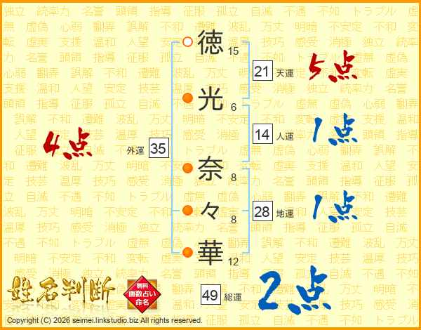 徳(15画)光(6画) 奈(8画)々(8画)華(12画)