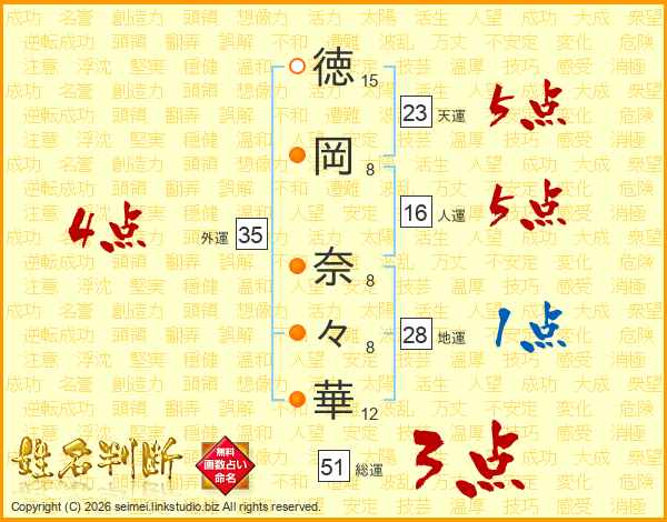 徳(15画)岡(8画) 奈(8画)々(8画)華(12画)