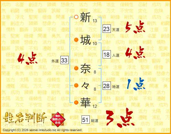 新(13画)城(10画) 奈(8画)々(8画)華(12画)