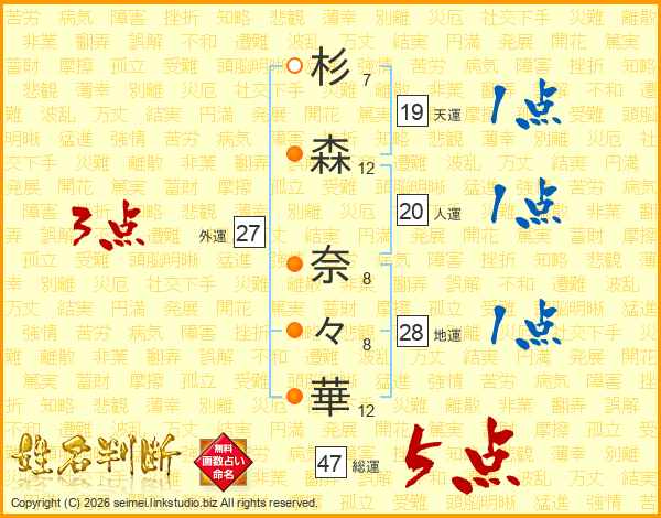 杉(7画)森(12画) 奈(8画)々(8画)華(12画)