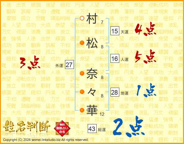村(7画)松(8画) 奈(8画)々(8画)華(12画)