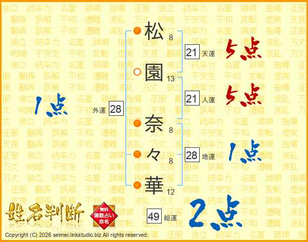 松(8画)園(13画) 奈(8画)々(8画)華(12画)