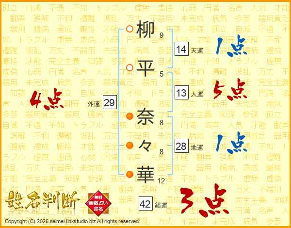 柳(9画)平(5画) 奈(8画)々(8画)華(12画)