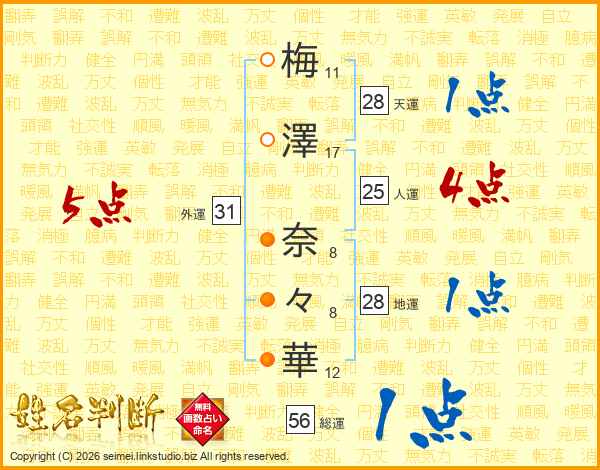 梅(11画)澤(17画) 奈(8画)々(8画)華(12画)