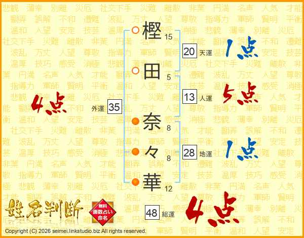 樫(15画)田(5画) 奈(8画)々(8画)華(12画)