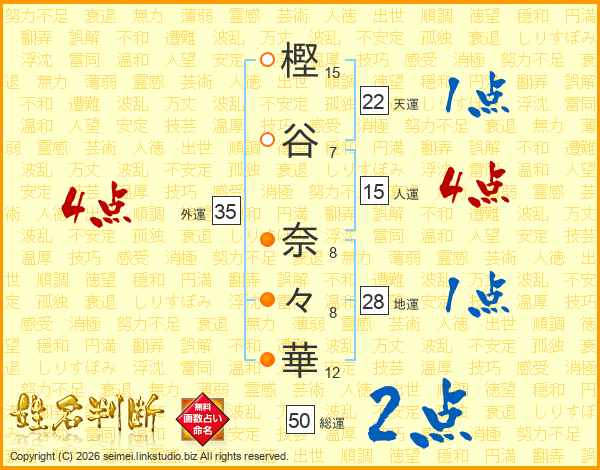 樫(15画)谷(7画) 奈(8画)々(8画)華(12画)
