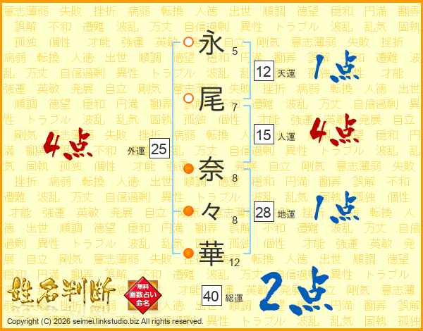 永(5画)尾(7画) 奈(8画)々(8画)華(12画)