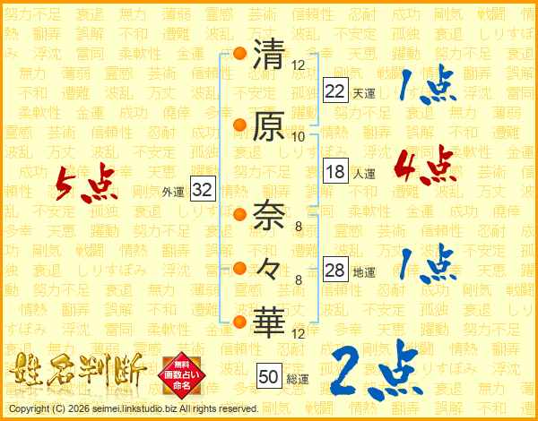 清(12画)原(10画) 奈(8画)々(8画)華(12画)